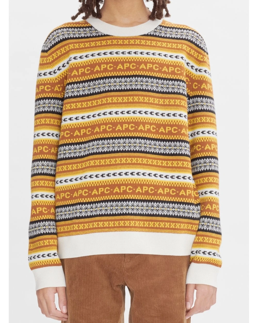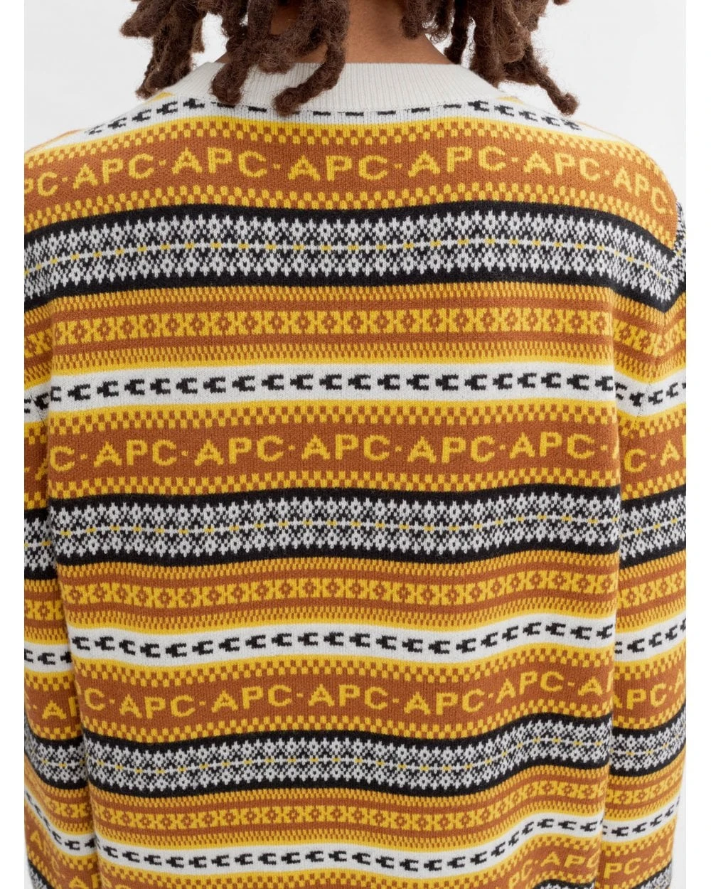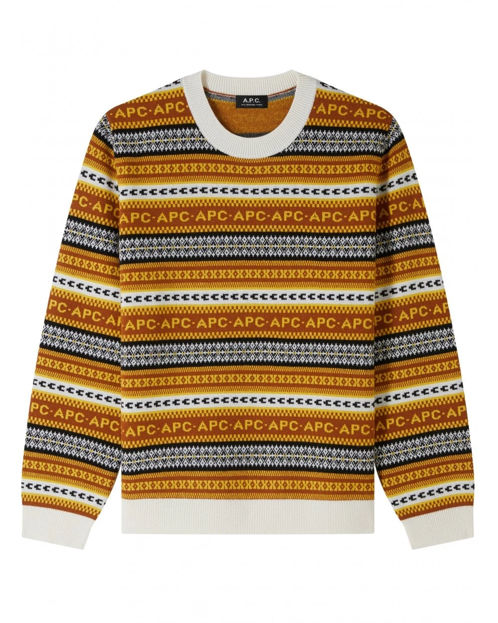 - A.P.C repeat letter pattern, with different alternating patterns on the chest and arms
