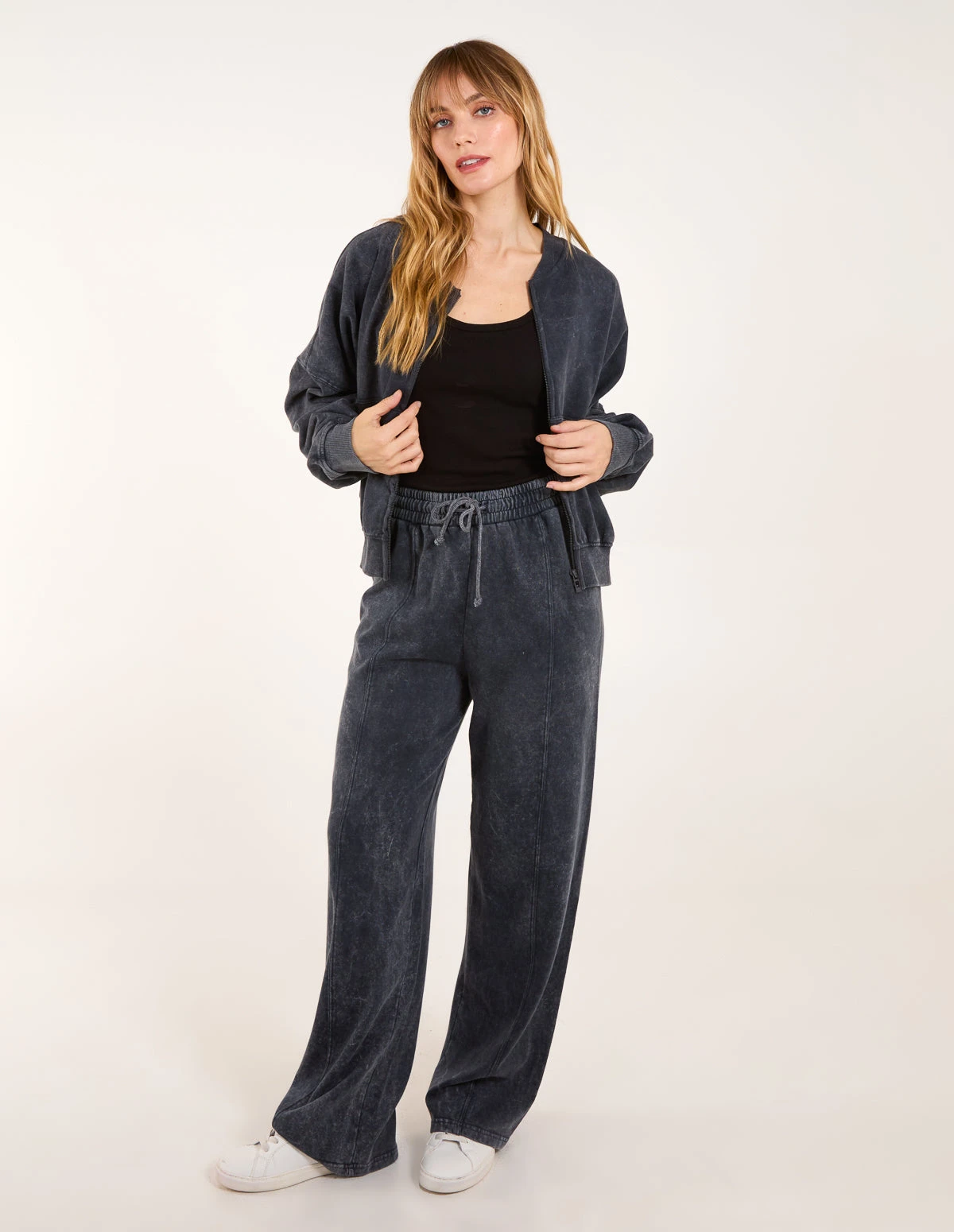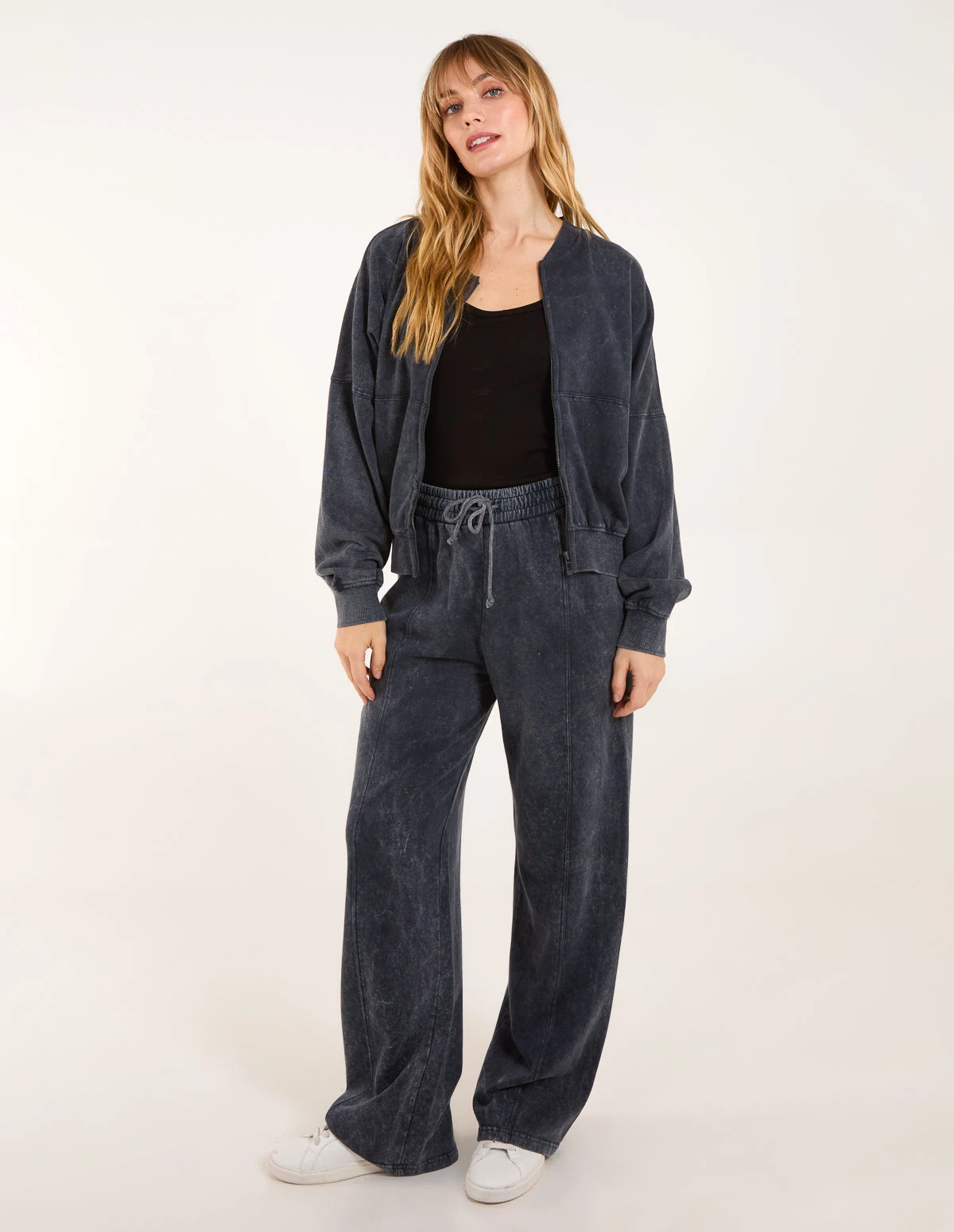 Who said loungewear couldn’t trendy. Team this Acid wash bomber jacket and flared trousers with sneakers and beanie and rock the cold weather in style. Â Â Â