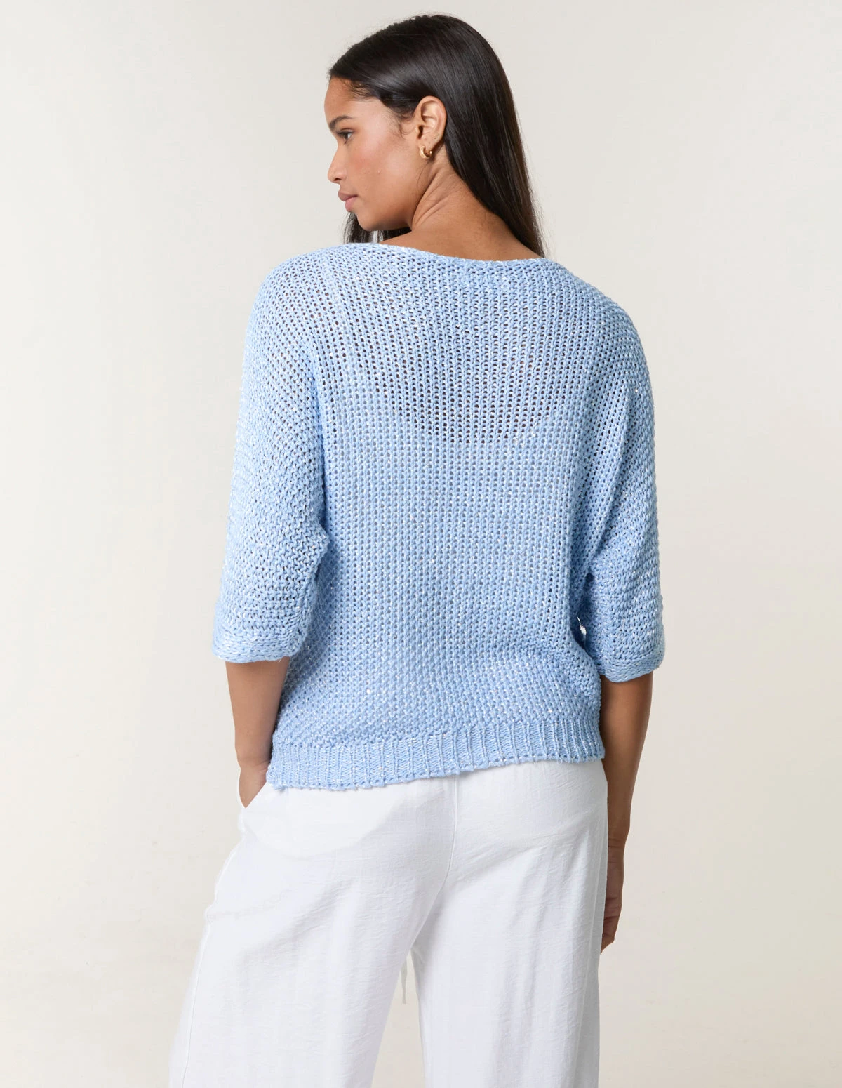 Sparkle in crochet! This pastel blue knitted top can be the perfect layering piece.Â