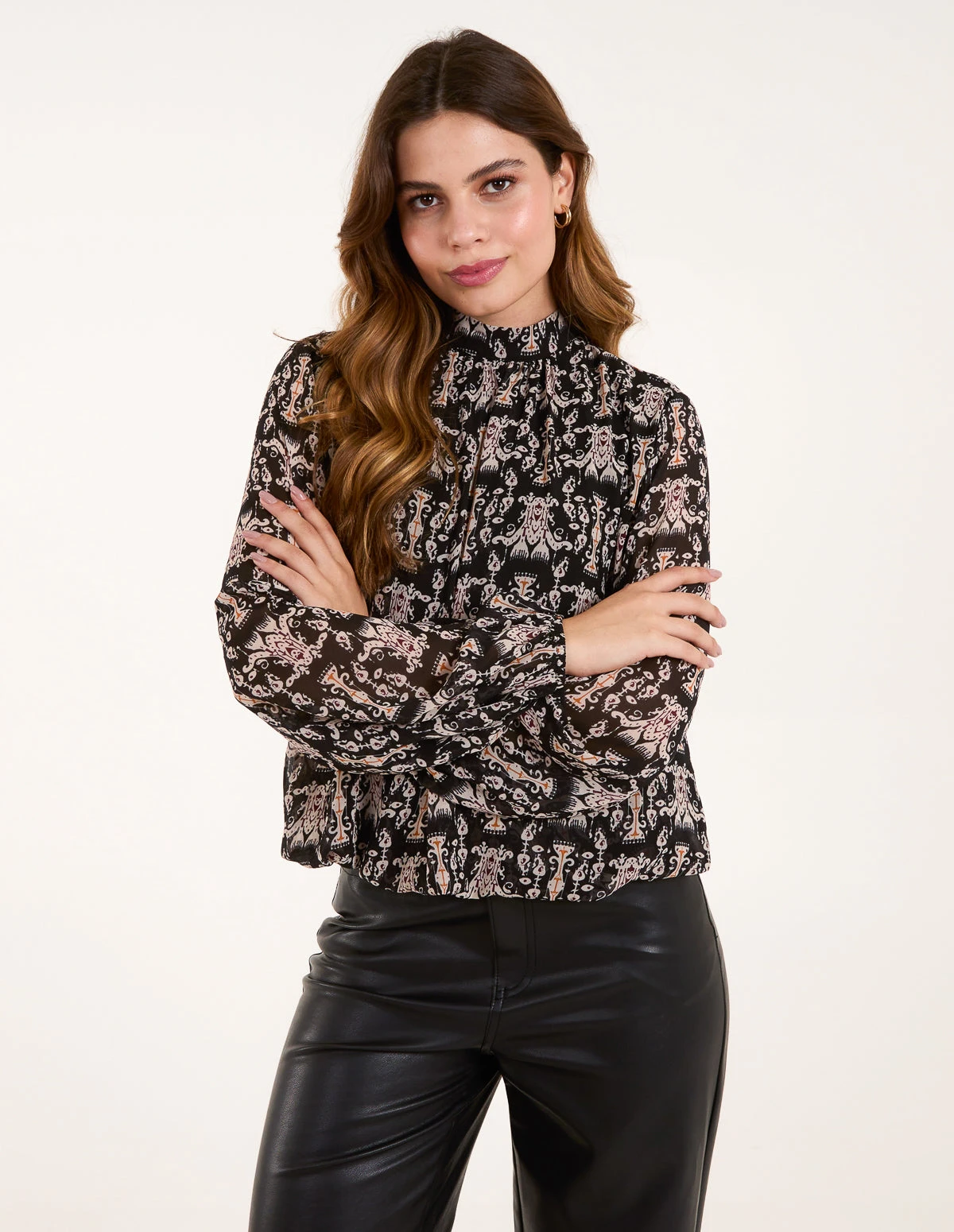 A truly classy blouson top, with puff long sleeves and a high neck to keep things simple yet professional. A perfect top to wear at your workplace, style with black trousers and high heel shoes.