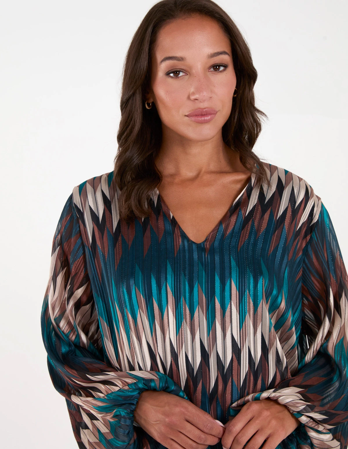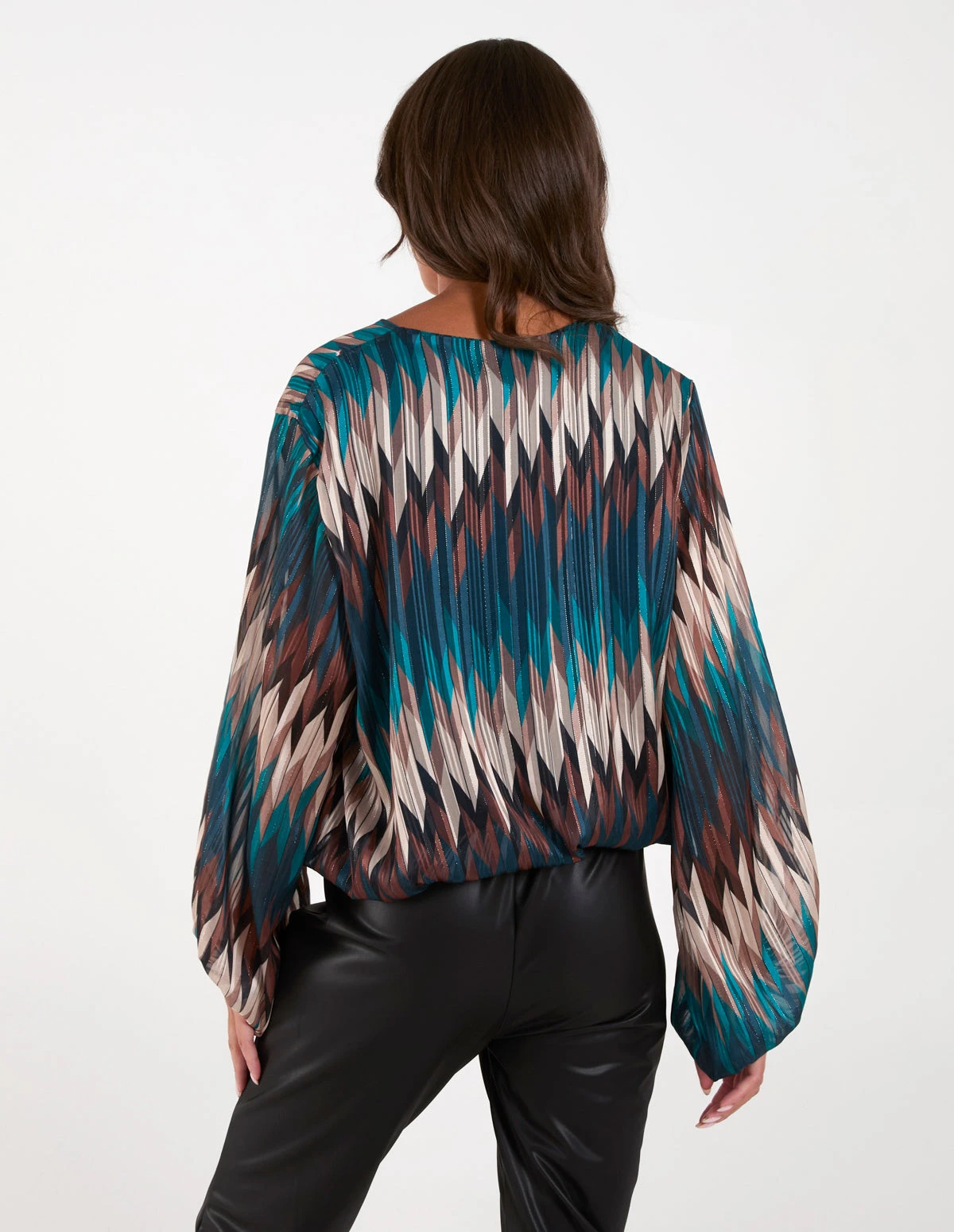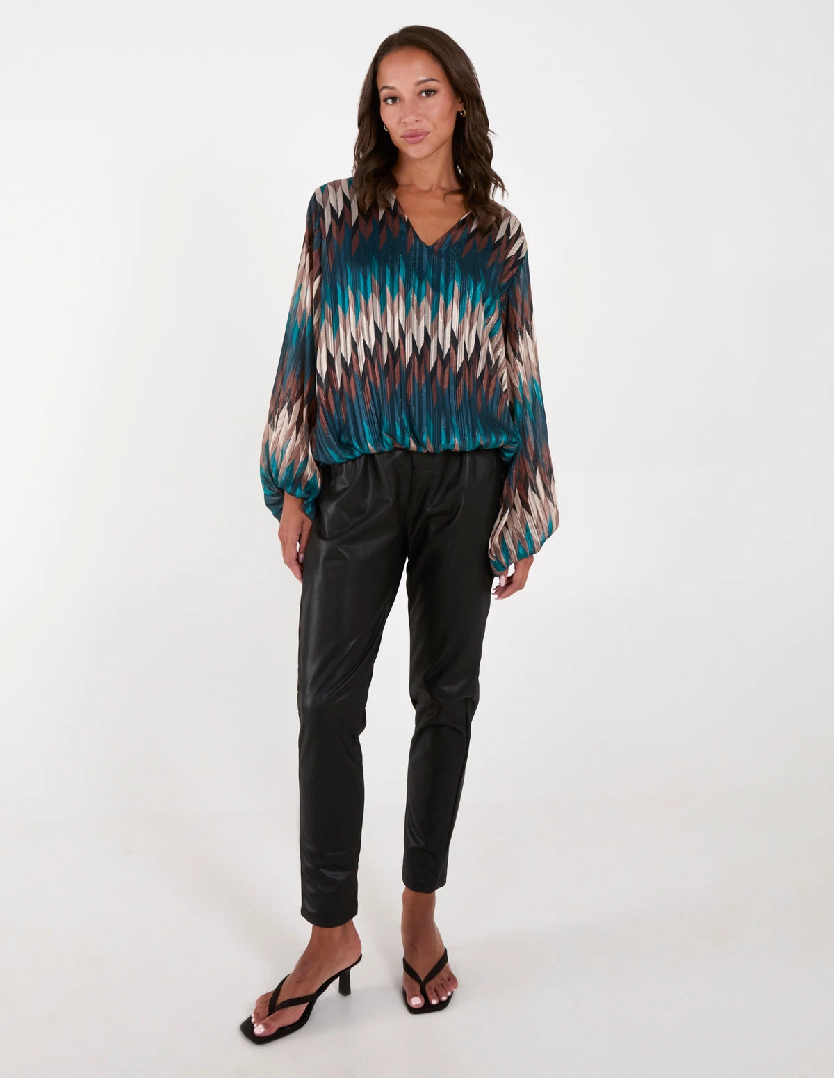 The kind of blouse that will take you from desk to date night with no fuss! Team this chevron blouse with black chinos, pumps and a trench coat