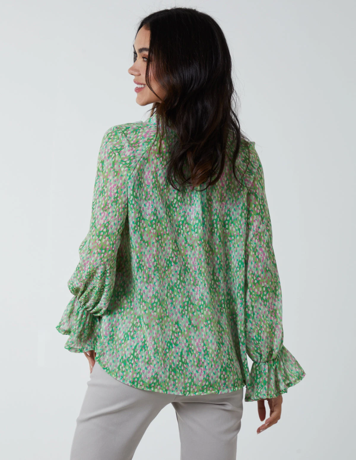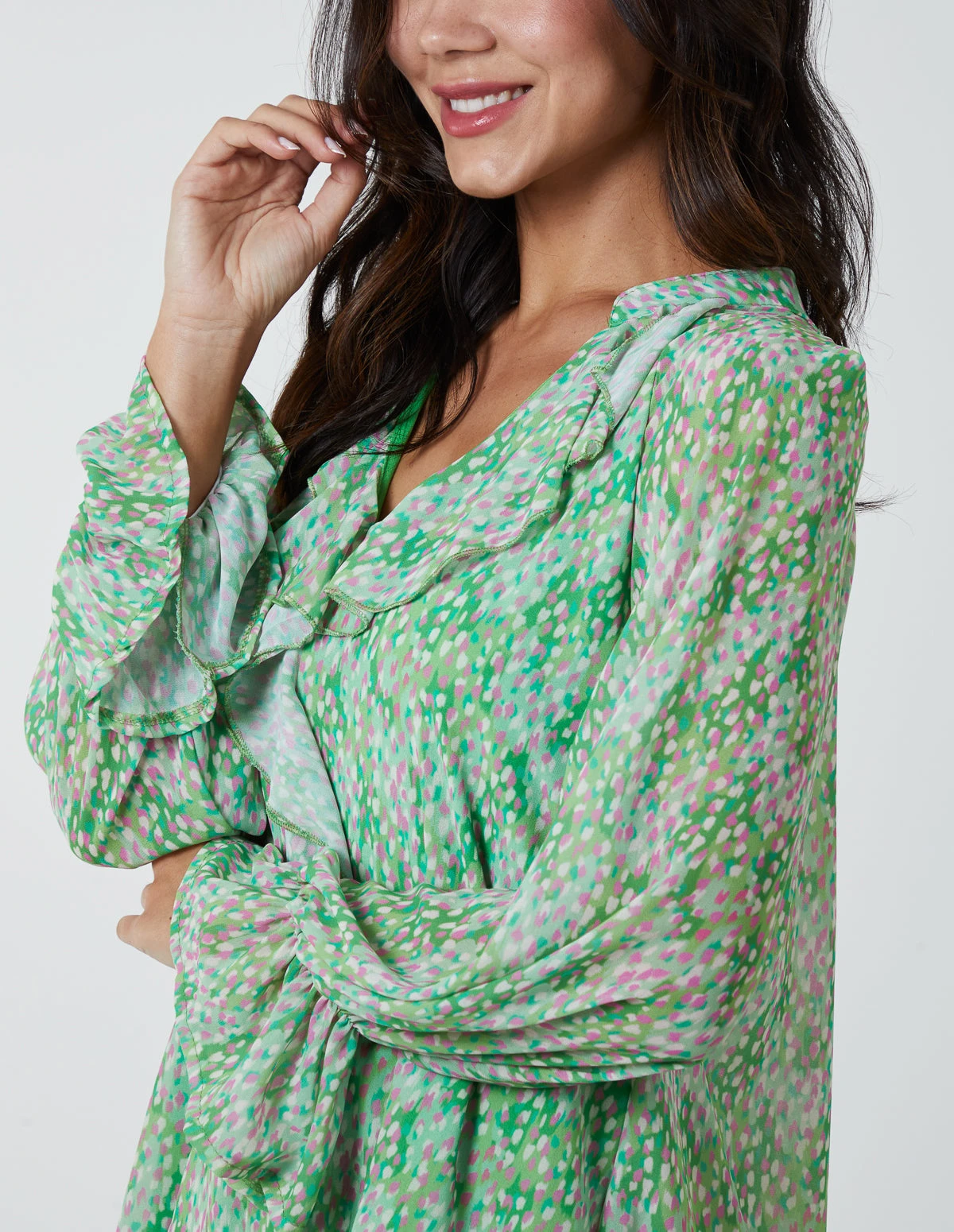 This relaxed-fitting chiffon frill blouse has a ruffle detail running the length of the front of the blouse and a long sleeve finished with a smock detail cuff. A wearable work-to-weekend piece.Â