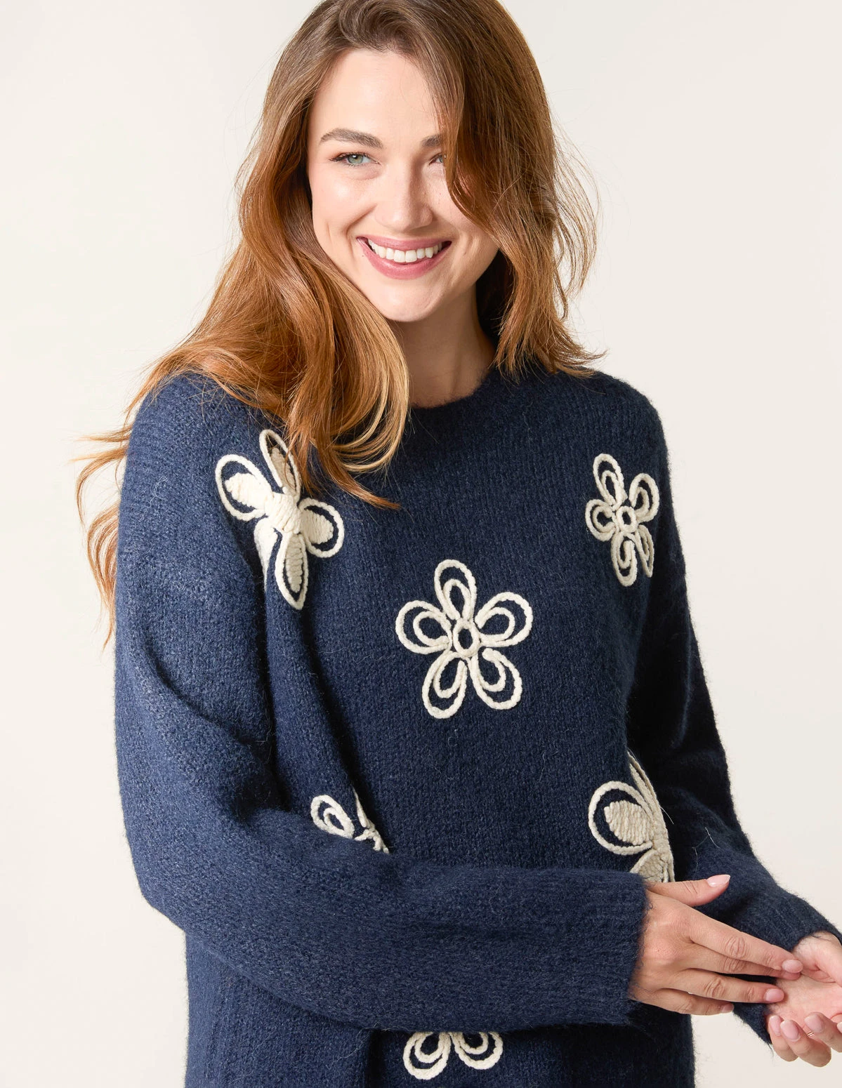 A cute, cosy and iconic jumper, taking embroidery for SS into AW. Team this flower embroidery jumper with flared jeans and PU leather boots.