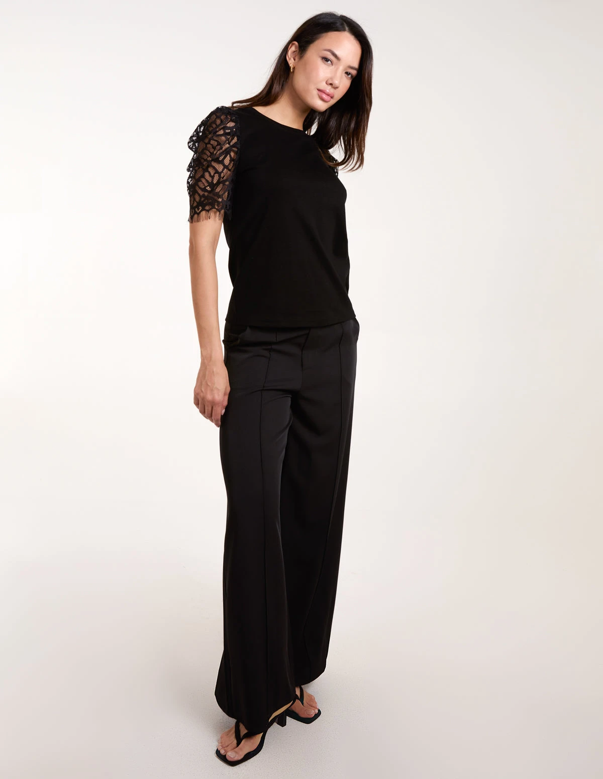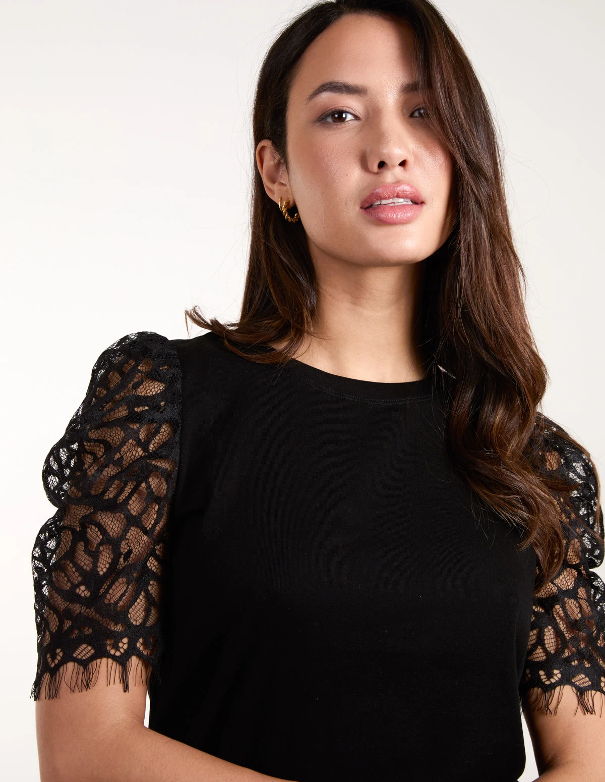 This T-shirt has a spin on your everyday tee. Featuring a romantic lace detailed sleeve, team with mom jeans, a blazer and trainers.