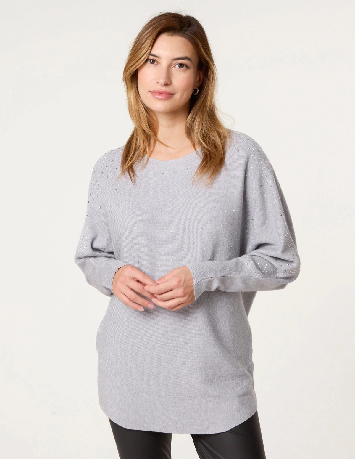 This cosy diamante detailed jumper is sure to be worn on repeat all season long. Its simple design and relaxed fit means it’ll see you through each and every cold season. It’s diamante detail adds some glam to your everyday wear. Â Â Â