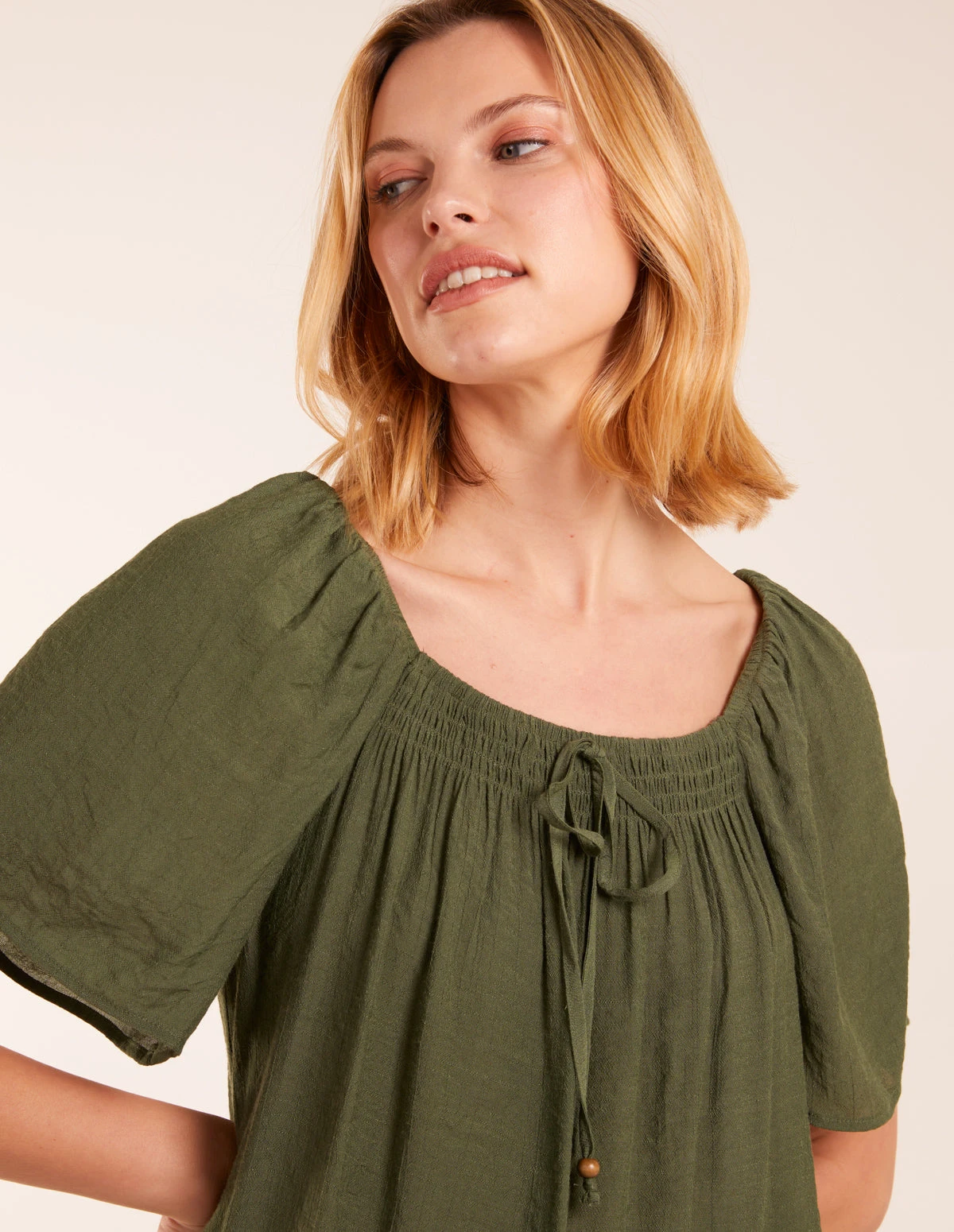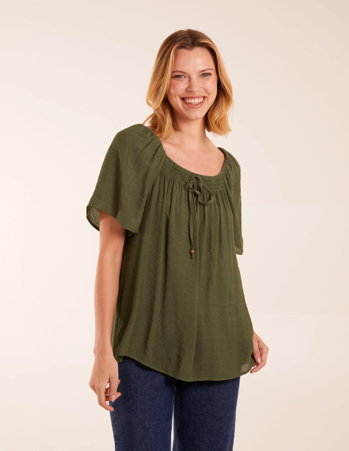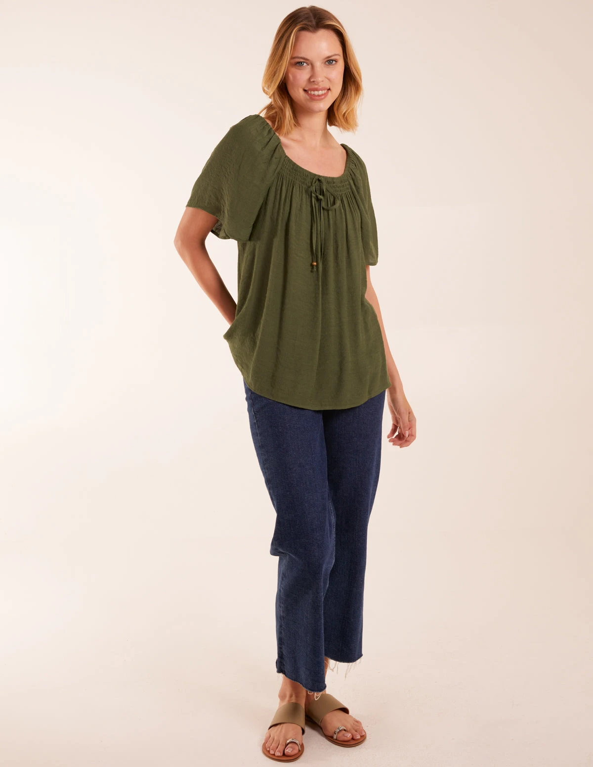 Milkmaid Shirred Swing Top(Khaki Milkmaid Shirred Swing Top)