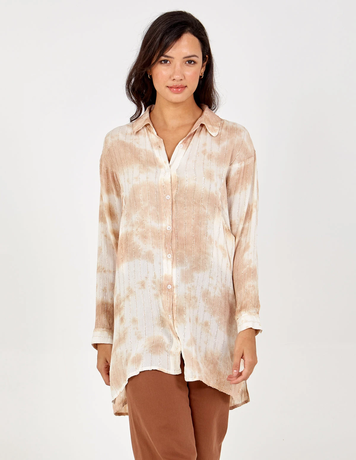 A trendy tie dye shirt perfect for those warmer days ahead!