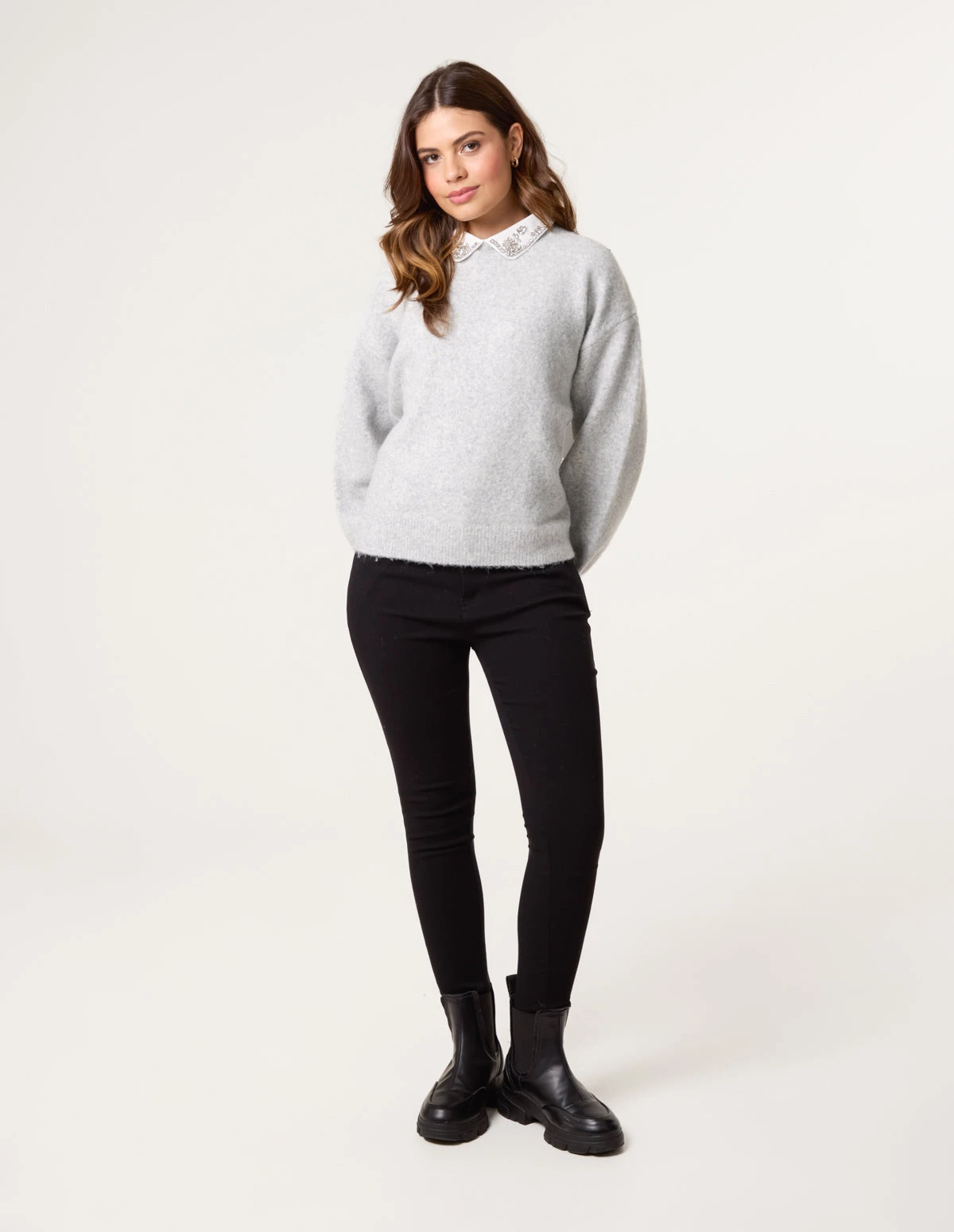 This collar detail jumper is the perfect piece to elevate your workwear knitwear collection. Simply team with tights and a PU skirt, and pumps and be ready to take on the working day in style. Â Â