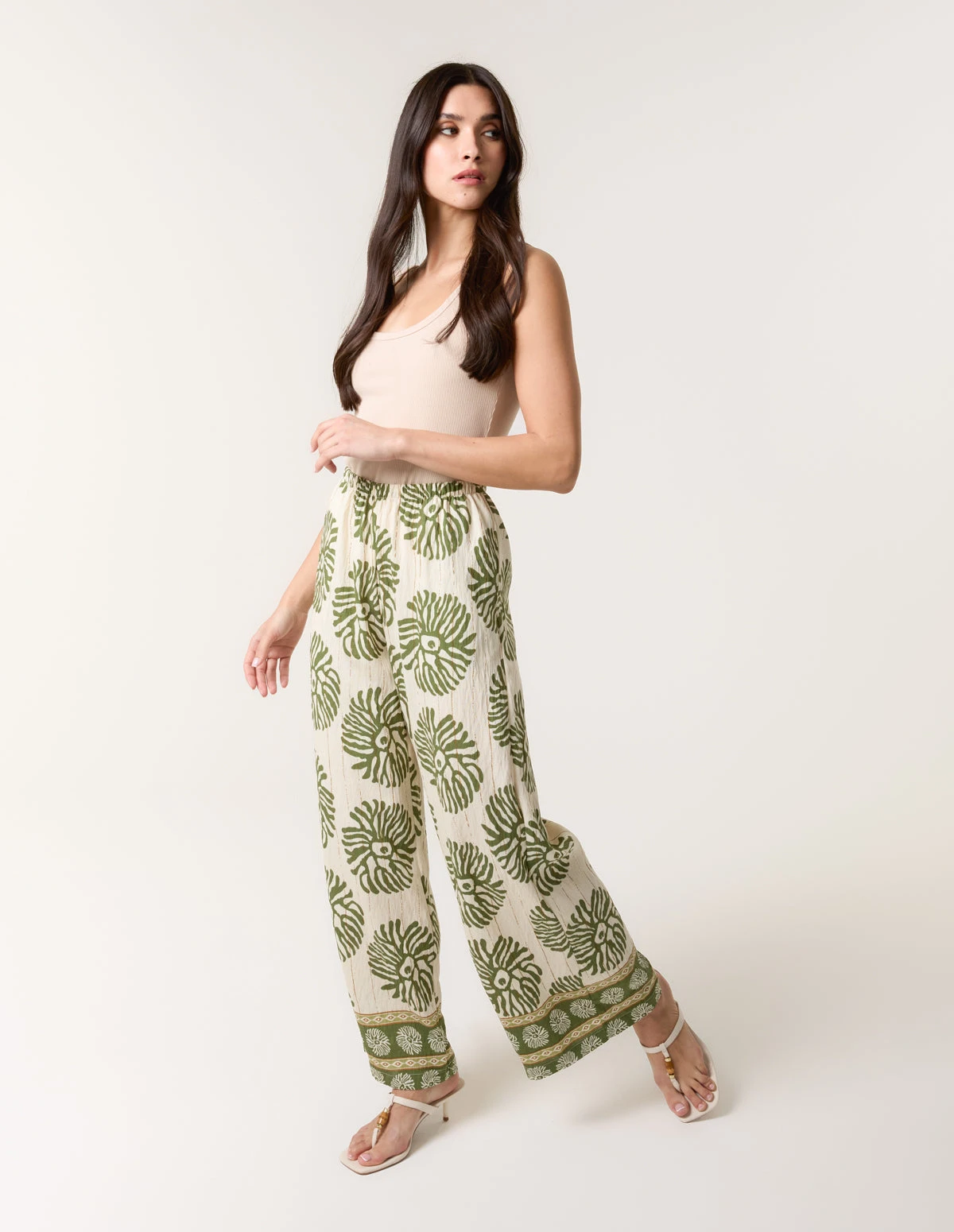 Take your every day look to the next level this season. Team these tropical printed wide leg trousers with a basic tee and sandals.