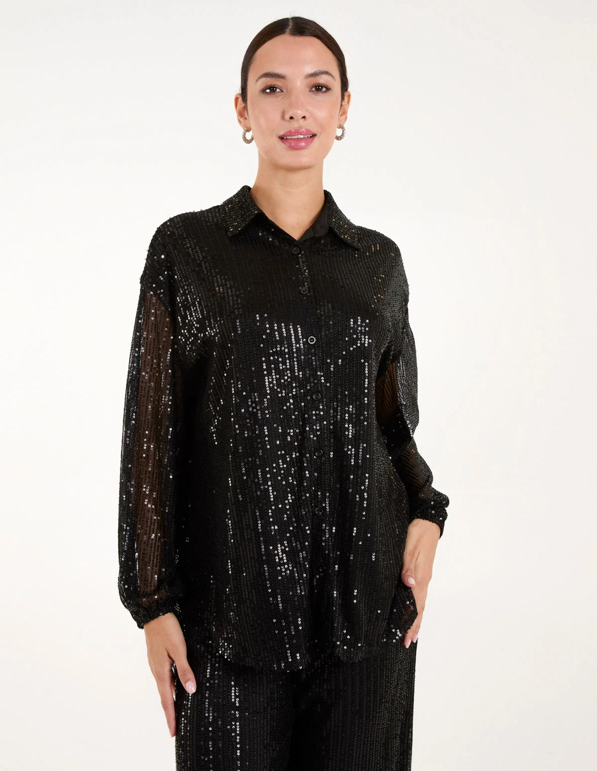 A new sparkly piece to add to your partywear collected. If you’re looking to dazzle the guests at an upcoming party, piece this sequin shirt with a formal wide leg trousers. And be sure to light up the room as much as the disco ball.