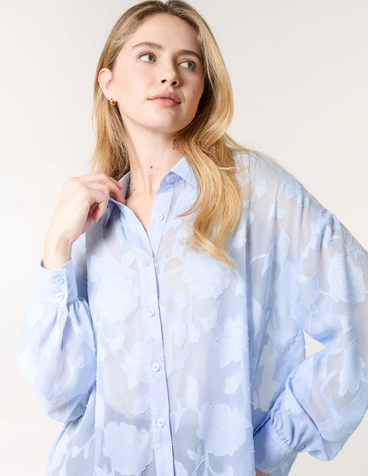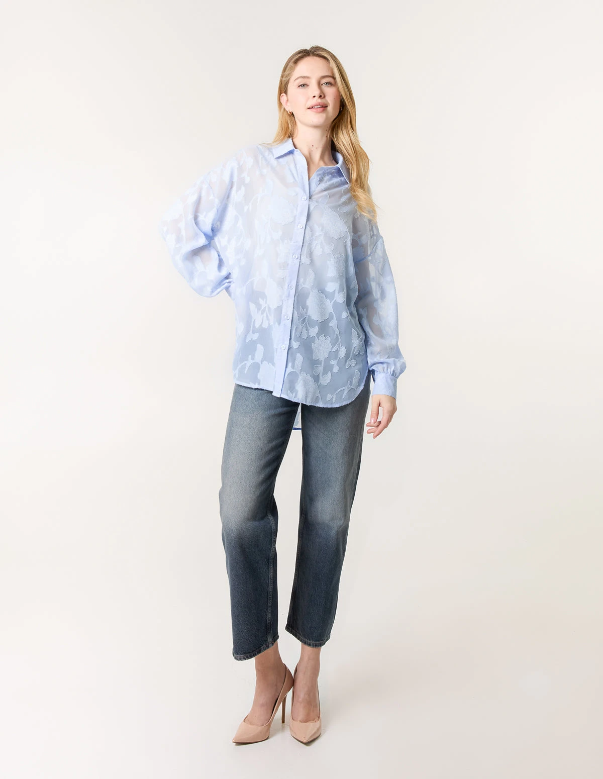 A pretty pastel option for you to choose from this season! This elegant mesh blouse looks perfect teamed with denim jeans, a cream blazer and pumps.