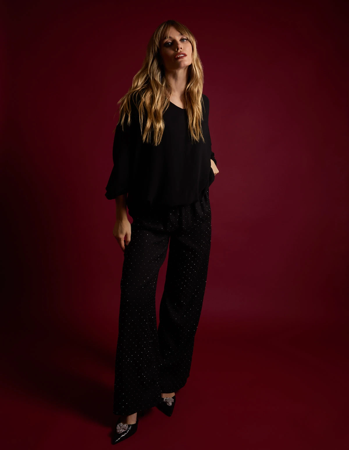 Walk into the room and sparkle this party season! These stud detailed flare trousers are nothing but glam! Team with a pretty blouse and strappy heels. Â Â