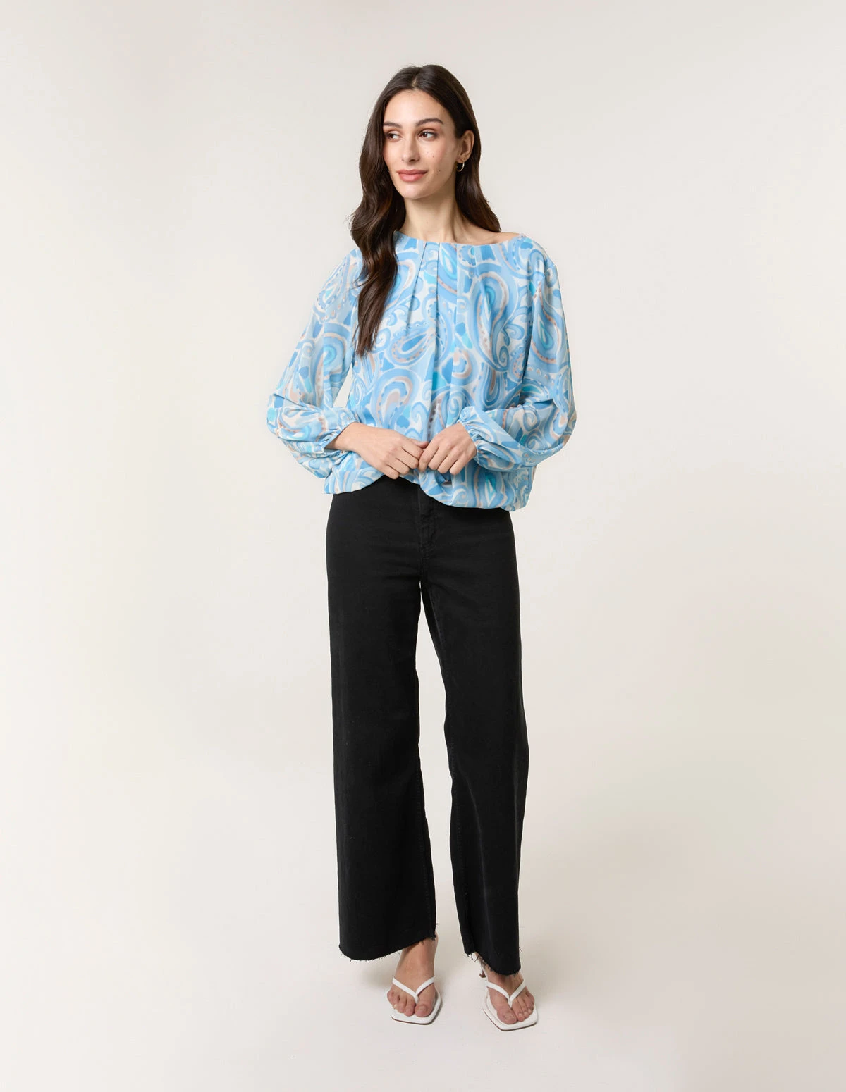 A fun option for when the weather begins to warm up! Team this paisley, watercolour blouse with white denim trousers and sandals.