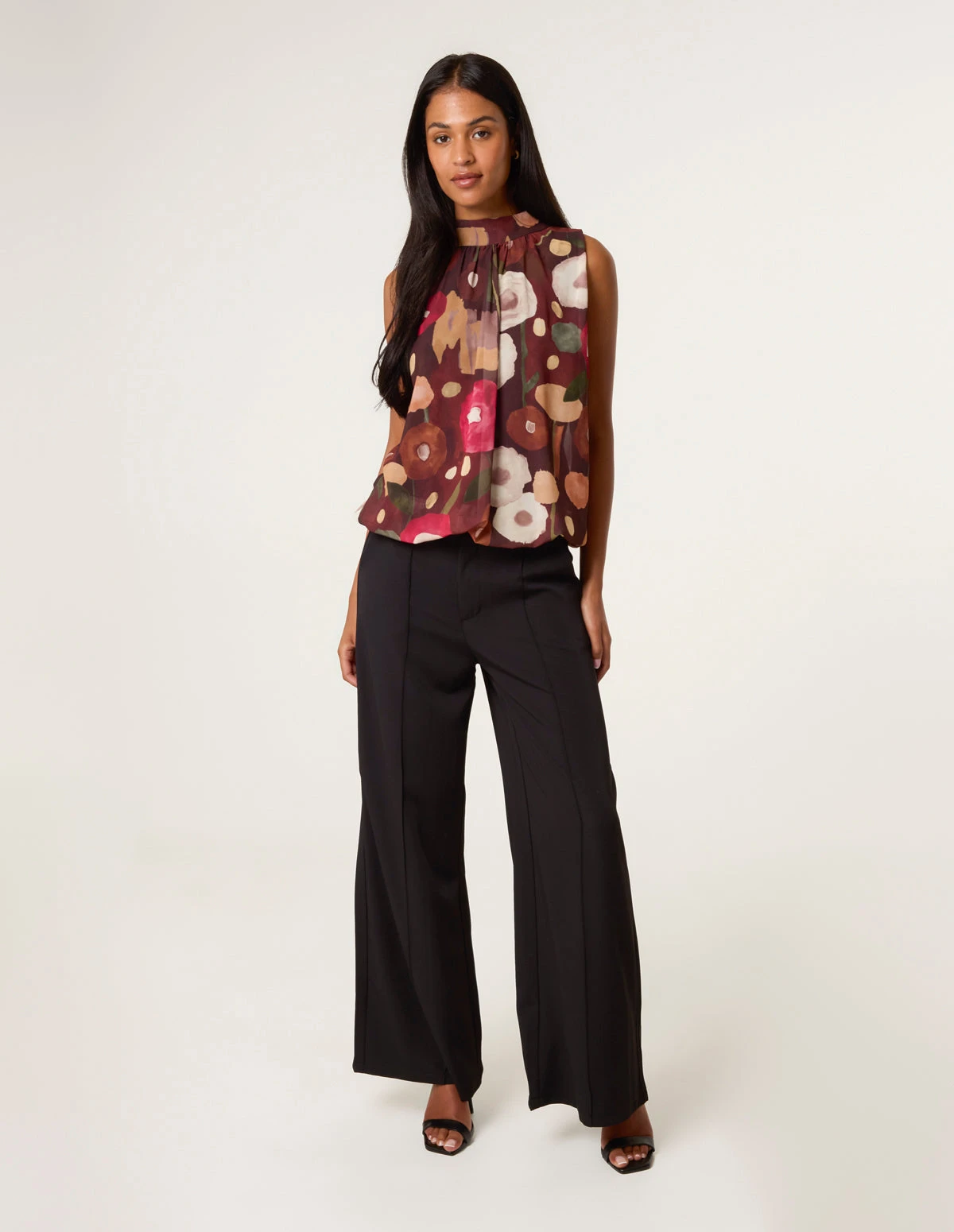 Oh so autumnal, team this watercolour blouse with brown PU leather trousers and heels for the perfect date night look.