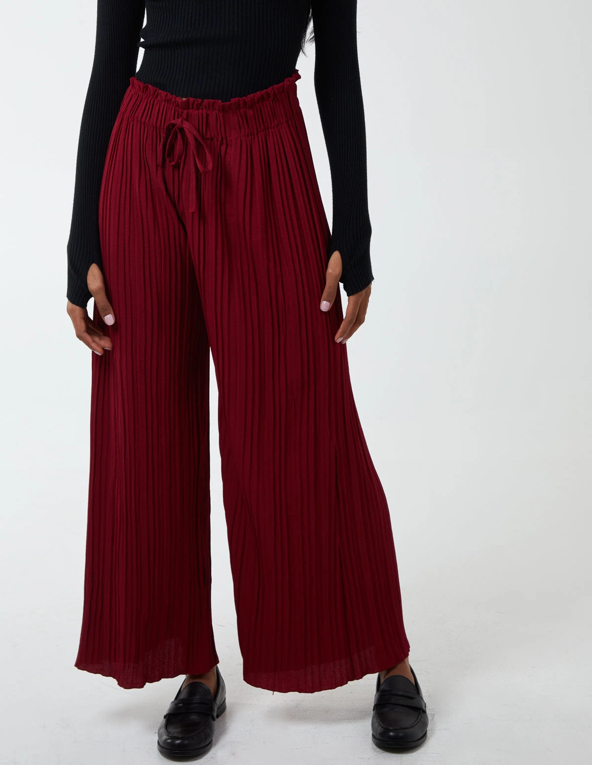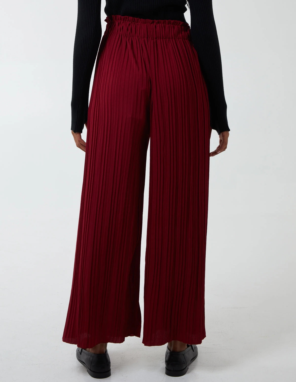 Don’t you love a pair of comfy trousers that you can wear all day long? That’s exactly what these trousers are, for you! These pleated trousers have a waist belt to perfect fit your lovely figure, and it will look wonderful when worn with a white short sleeve bodysuit and caramel sandals.